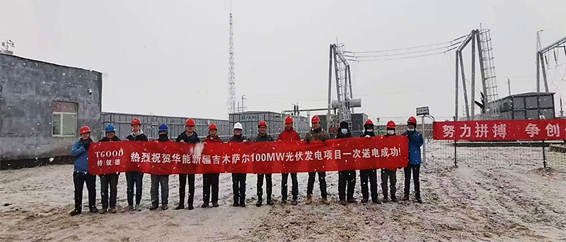 新疆華能吉木薩爾光伏項目中,施工場地上,售后和技術(shù)人員為保證能在問題發(fā)生的第一時間解決問題,駐場一個多月;并網(wǎng)送電前,銷售與項目經(jīng)理多方協(xié)調(diào)處理現(xiàn)場異常,制定最優(yōu)解決方案,保障送電時間節(jié)點。項目地環(huán)境惡劣,冰天雪地,各項工作的開展都受到了冰雪的影響,現(xiàn)場人員每天開始工作前還需要進(jìn)行除雪作業(yè),增加了現(xiàn)場施工的難度,但即便如此,特銳德川開電氣確保了送電成功的紅色橫幅如期在大雪中飄揚(yáng)。