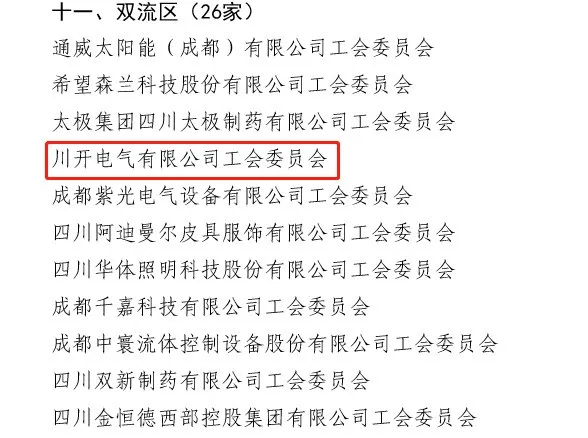 ???? 9月11日,雙流區(qū)西南航空港經(jīng)濟(jì)技術(shù)開發(fā)區(qū)工會(huì)代表成都市總工會(huì)向川開電氣公司工會(huì)授牌,授予川開電氣有限公司工會(huì)“成都市五星級(jí)工會(huì)”稱號(hào)。這既是對(duì)過(guò)去一年公司工會(huì)工作的極大肯定,也是對(duì)新一年工會(huì)工作的有利鞭策。