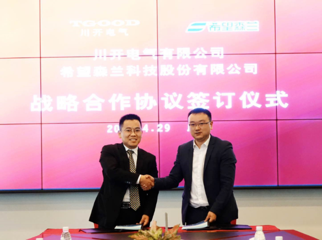 ? ? ?4月29日,川開電氣有限公司和大陸希望集團旗下希望森蘭科技股份有限公司簽署戰(zhàn)略合作協(xié)議,雙方將會在“企業(yè)文化與管理經(jīng)驗交流、市場資源整合、共同開發(fā)市場、 岸電系統(tǒng)/高低壓變頻設(shè)備開發(fā)、 配套產(chǎn)品生產(chǎn)及生命周期服務(wù)、 跨界營銷合作”等領(lǐng)域展開深度合作