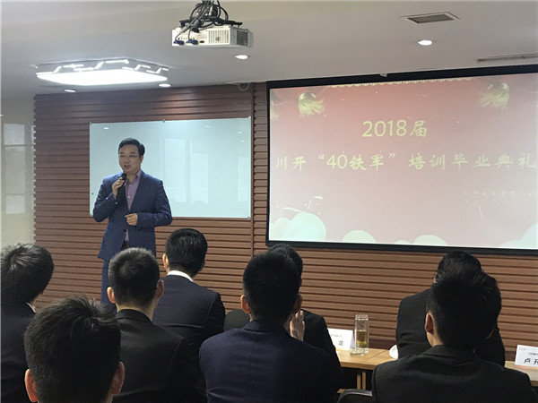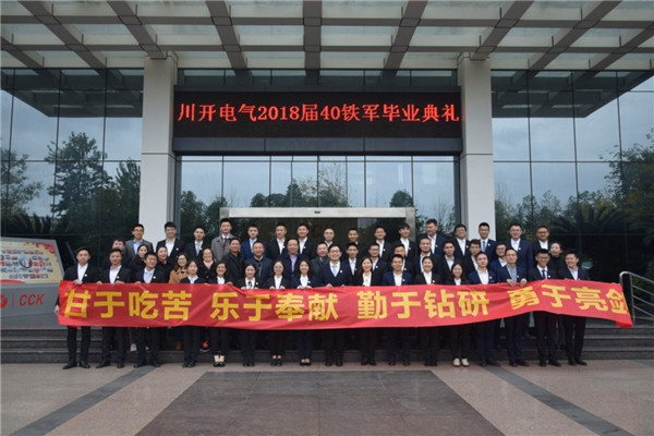 2018年11月16日,第一屆川開電氣40鐵軍畢業(yè)典禮在公司六號(hào)會(huì)議室舉行,共有31位戰(zhàn)友經(jīng)歷為期108天的培訓(xùn)后順利畢業(yè)。川開電氣總經(jīng)理李軍,副總經(jīng)理?xiàng)罾颉⒃篮?、李桂英,四川區(qū)域營(yíng)銷總監(jiān)周建忠,變電站事業(yè)部副總經(jīng)理黃愷以及營(yíng)銷中心主任劉玉榮,人力資源部部長(zhǎng)裴曉霜等相關(guān)領(lǐng)導(dǎo)出席畢業(yè)典禮。