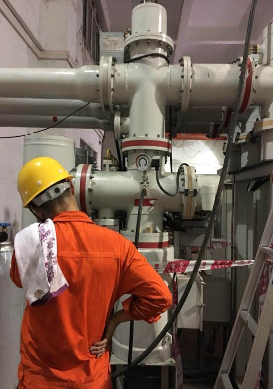 7月16日起,川開電氣全資子公司——特銳德西明電力有限公司啟動(dòng)了重鋼110kV GIS 組合開關(guān)5個(gè)氣室微水超標(biāo)和2個(gè)氣室漏氣的維保項(xiàng)目,此次項(xiàng)目包括戶外氣室及戶內(nèi)氣室。GIS的廠家較多,設(shè)備多樣性,且現(xiàn)場沒有任何降溫措施,給維保工作帶來了一定困難。但參與項(xiàng)目的全體戰(zhàn)友們不懼高溫,迎難而上,在50多度高溫的炎炎烈日下連續(xù)奮戰(zhàn)。