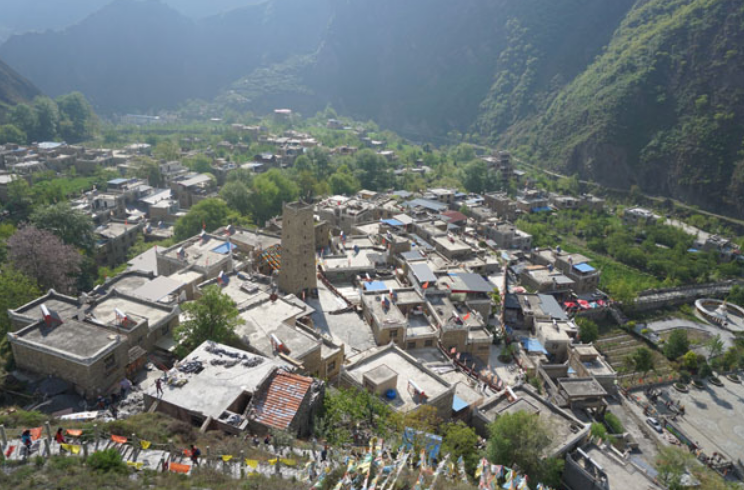 23日上午我們從理縣出發(fā)趕往甘堡藏寨。甘堡藏寨是“嘉絨藏區(qū)第一寨”。同行的人們紛紛推動轉(zhuǎn)經(jīng)筒為家人祈福。從日月廣場往前走,直到屯兵廣場和點將臺,拾梯而上,遠(yuǎn)遠(yuǎn)地就能看到墻上有一幅巨大的格薩爾王彩繪,寨子后山上經(jīng)塔佇立,各色的經(jīng)幡隨微風(fēng)揚(yáng)起,順山勢而下,綺麗而又壯觀,讓人流連忘返。