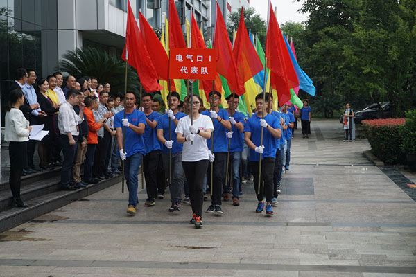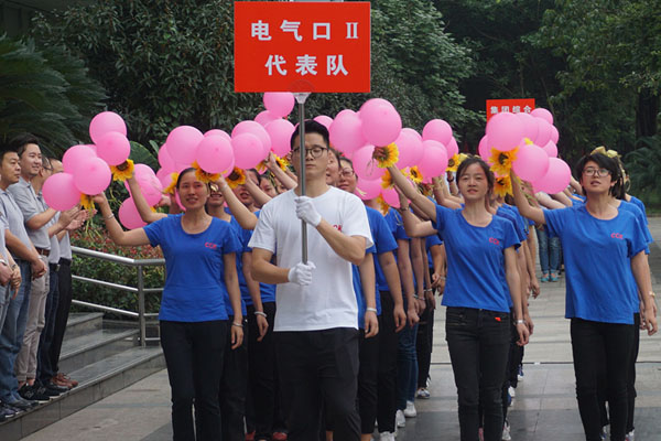 伴隨著激昂的運(yùn)動(dòng)員進(jìn)行曲,下午3點(diǎn),開幕式正式開始。來自集團(tuán)綜合、電氣口(Ⅰ、Ⅱ隊(duì))、電梯口、村田機(jī)械等5支代表隊(duì)邁著整齊的步伐依次入場(chǎng)。電氣口的兩支代表方隊(duì),一支颯爽英姿,充滿朝氣,高舉絢麗的氣球,寓意放飛美好明天的愿景;一支斗志昂揚(yáng),鏗鏘有力,手持斑斕的彩旗,象征沖鋒每個(gè)勝利的目標(biāo)。各方隊(duì)霸氣的口號(hào)響徹云霄,充分展現(xiàn)了川開人奮發(fā)向上的良好風(fēng)貌,表達(dá)了大家“永不言敗、永不言退”的決心和信心。