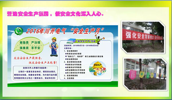 以“查隱患 嚴(yán)治理 強(qiáng)素質(zhì) 享平安”為主題的川開電氣第6屆安全月活動(dòng),在活動(dòng)領(lǐng)導(dǎo)小組的帶領(lǐng)下,各活動(dòng)小組圍繞活動(dòng)主題,組織實(shí)施了各專題活動(dòng)?;顒?dòng)于6月30日劃上了圓滿的句號(hào)。通過為期一個(gè)月活動(dòng)的開展,全員普及了安全知識(shí),提高了安全意識(shí),增強(qiáng)了安全技能。達(dá)到了活動(dòng)的目的——發(fā)出安全生產(chǎn)最強(qiáng)音 激發(fā)安全生產(chǎn)正能量。