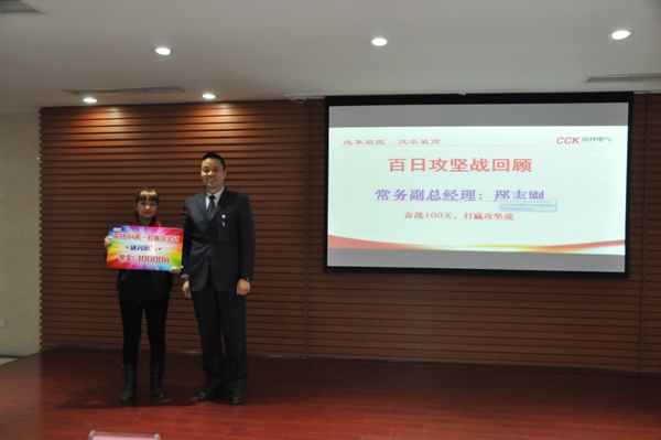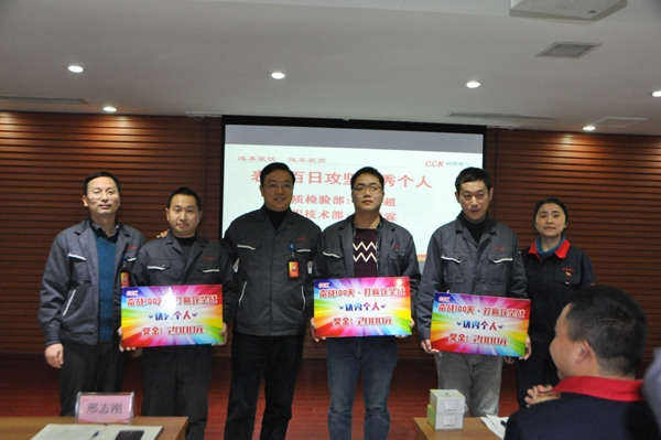 總結(jié)議程告一段落之后,會(huì)議進(jìn)入第二個(gè)重要部分——表彰環(huán)節(jié),以“奮戰(zhàn)100天,打贏攻堅(jiān)戰(zhàn)”為主題的百日會(huì)戰(zhàn)從2015年10月份持續(xù)到2015年12月,這也是川開(kāi)電氣史無(wú)前例的一次持續(xù)時(shí)間最長(zhǎng)、參與面積最廣的生產(chǎn)大會(huì)戰(zhàn)。經(jīng)過(guò)三個(gè)月的激烈角逐,最終評(píng)比出了此次百日攻堅(jiān)戰(zhàn)的優(yōu)秀團(tuán)隊(duì)和優(yōu)秀個(gè)人。來(lái)自裝配車間的周先芬組以明顯的優(yōu)勢(shì)摘得優(yōu)秀團(tuán)隊(duì)桂冠。獲得優(yōu)秀個(gè)人的分別是:工程技術(shù)部黃曦霖、中低壓部柜體車間楊興勇和品質(zhì)檢驗(yàn)部劉超,他們是奮進(jìn)川開(kāi)人中的一小部分,卻折射出了川開(kāi)電氣拼搏向上的企業(yè)之魂。
