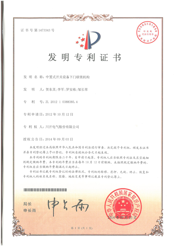 2014年10月20日,我公司獲得由國(guó)家知識(shí)產(chǎn)權(quán)局頒發(fā)的“中置式開(kāi)關(guān)設(shè)備下門(mén)聯(lián)鎖機(jī)構(gòu)”發(fā)明專(zhuān)利證書(shū),標(biāo)志著我公司知識(shí)產(chǎn)權(quán)工作再上新臺(tái)階,為知識(shí)產(chǎn)權(quán)工作樹(shù)立了一個(gè)里程碑。