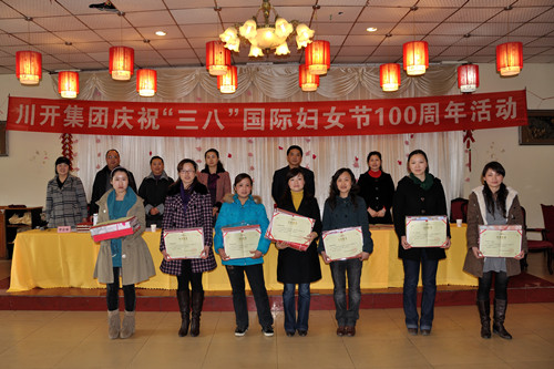 ??? 會議首先由簡興福董事長首先向全體女員工們表示節(jié)日祝福,充分肯定了女員工們?yōu)槠髽I(yè)發(fā)展做出的努力和貢獻(xiàn)并提出新的希望。女工委員會主任趙玲作專題發(fā)言激勵全體女員工要自立、自信、自強(qiáng),充分發(fā)揮“半邊天”的作用。李會春副主任作《2009年度集團(tuán)公司婦女工作總結(jié)》。我公司陶厚珍等15名女員工榮獲“川開集團(tuán)2009年度女標(biāo)兵”稱號并受到表彰,集團(tuán)總裁王洪先生號召全體女員工以標(biāo)兵和先進(jìn)為楷模,愛崗敬業(yè),為公司發(fā)展做出新的更大貢獻(xiàn)。