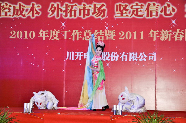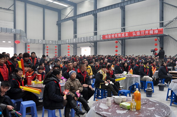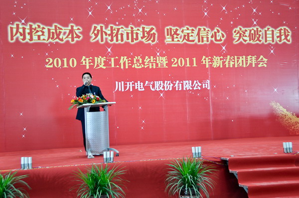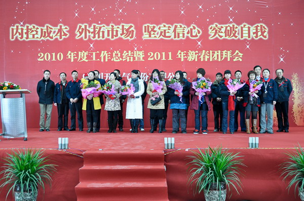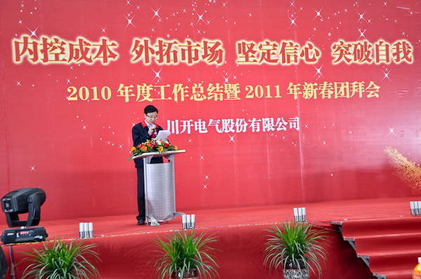 ??? 簡(jiǎn)興福董事長(zhǎng)首先代表集團(tuán)公司董事會(huì)向在場(chǎng)人員表達(dá)新春祝福!王洪、袁會(huì)云等領(lǐng)導(dǎo)發(fā)表了熱情洋溢的新春致辭。公司總經(jīng)理李軍對(duì)2010年工作進(jìn)行總結(jié),并對(duì)2011年工作進(jìn)行整體安排及部署。常務(wù)副總馬力代表公司對(duì)職工家屬們及供應(yīng)商的到來(lái)表示歡迎及感謝,希望在新的一年里大家能夠一如既往地支持我們,共創(chuàng)川開(kāi)美好明天。會(huì)上還對(duì)2010年度先進(jìn)工作者進(jìn)行了表彰。