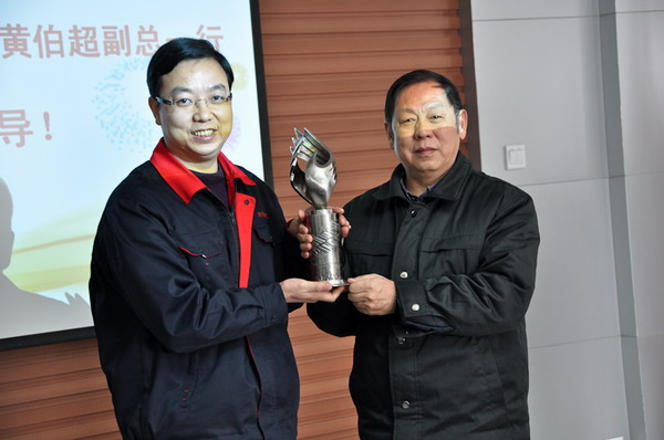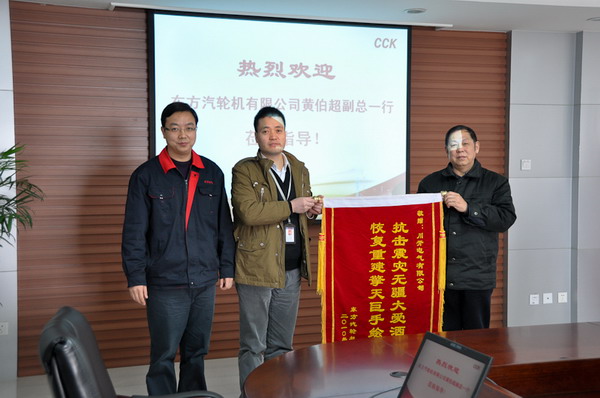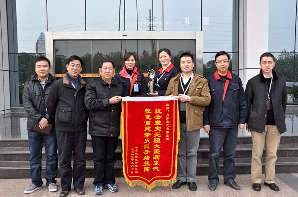 ??? 最后,黃伯超副總代表東汽公司授予我公司“抗擊震災(zāi)無疆大愛灑東汽、恢復(fù)重建擎天巨手繪藍圖”的旗幟以及象征友好互助的紀念杯,雙方合影留戀。我公司與東汽將攜手并進,共同承擔起國家建設(shè)發(fā)展重任,為推進國家環(huán)境建設(shè)和可持續(xù)發(fā)展貢獻力量。